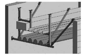 图6走廊样板区门型抗震支吊架的三维效果结合图4~图6,分析结果如下: (1)管线左边为结构墙,右边为砖墙,结构墙可以作为抗震支吊架的生根点,而砖墙则不能。 (2)管线左、右两边与结构墙之间的距离过近不足以做45°侧向斜支撑。 (3)水管右侧如设侧向支撑,桥架之间的空间不足以放置一根41×41×2的C型槽钢,且桥架还需单独设置门型吊架。 (4)管线之间的间距均足以放置垂直的C型槽钢作为垂直承吊槽钢及纵向斜支撑。 (1)将3个桥架降标高与风管底标高一致,将支吊架分为上下两层。 (2)将风管与桥架整体左移,以减少横担的跨度,也为右边侧向斜支撑准备一定的空间。 (3)最下层的横担经过挠度计算选型后,将横担左侧延伸至结构墙并用型钢底座进行生根固定,这样将横担与斜撑简化为一体,既能提高侧向抗震效果,又能节约材料。 (4)纵向斜支撑的安装位置分别设置在离两根垂直C型槽钢中心水平距离不超过200mm的最下层横担上,根据斜撑安装空间选择在垂直C型槽钢左右或者离其中心的距离不超过200mm横担上。 (5)根据实际安装空间设置右侧侧向斜支撑,横担上的生根位置同上,并保证其与垂直C型槽钢之间的夹角不小于30°,根据设防作用范围的地震力荷载,验算侧向支撑是否满足要求,结果证实达到要求。 2.2.2设计建议和解决方案 该实例是结合BIM技术解决抗震支吊架安装中最为常见的侧向斜支撑安装空间的问题,创新地将最下层横担延伸通过型钢底座与左侧结构墙进行生根,将侧向支撑改为一体的水平支撑,加大号的水平横担的抗拉压能力远高于普通斜支撑;将管线进行简要的空间位置布排,减少没必要的管线位置移动,减少横担的跨度,既节约空间,又节省型钢材料,达到了管线综合布排的要求。 针对常见的斜支撑安装空间的问题,特提出如下建议及解决方案: (1)根据支架周围的剪力墙、梁、柱、楼板等结构体,尽量选择可缩短斜支撑长度或者增大斜支撑角度的位置作为生根处。 (2)吊杆本身均具有抗剪切能力,特别是短的吊杆,当其抗剪切能力能够满足下端管线的地震力荷载时,可选择将斜支撑安装在垂直的C型槽钢吊杆及加劲槽钢上,但距离管线质心的垂直距离不得大于300mm。 (3)如是多层门型吊架,可选择在横担与垂直C型槽钢连接处附近增设斜支撑,直到满足抗震要求,这样才能在满足不超过国标要求的最大间距的情况下,尽量减少一段管线上抗震支吊架的数量。 (4)柔性钢索对空间要求相对较低,在成对对称布置的前提下,也可考虑柔性抗震支吊架的应用。 2.3BIM技术在抗震支吊架系统中的应用特点 设计与施工之间的协调更改一直是施工的重点和难题,特别是在支吊架领域,由于支吊架是附着在管道以及结构上,需考虑施工现场的实际空间环境等因素。目前项目施工往往需要有经验的施工者根据图纸与想象结合现场安装空间位置来决定,同时会影响其他专业管路的安装变更。利用传统的CAD预先所布置的点位,例如广州某项目,采用抗震支吊架系统,由于现场实际安装条件,安装线路与设计图纸有一定的偏差,导致多次施工图纸变更。BIM软件,在设计院所交付的BIM图上直接进行布点,充分考虑建筑的结构,在设计阶段便已考虑支吊架的生根点,从而避免了反复更改图纸带来的麻烦与浪费。 BIM软件在设计阶段提前充分考虑到管线综合的细节问题,避免问题遗留到施工阶段。通过施工模拟演练,能更快、更精准地提前统计出各时间点所需的材料,便于材料的把控。更是可以利用BIM技术直观地预推出材料的堆放位置以及补料时间,节约搬运材料的劳动力,便于现场的综合管理[3]。中国第一个全BIM项目———总高632m的“上海中心”,通过BIM提升了规划管理水平和建设质量,据有关数据显示,其材料损耗从原来的3%降低到万分之一。 3结语 运用BIM的可视化管理,模拟化演练,打破现有支吊架安装的传统模式,全面预先在安装位置的结构里放置预埋件,抗震支吊架安装时,只需用相应的连接构件与预埋件进行紧固安装,避免了锚栓对结构的破坏。抗震支吊架各个构件通过BIM的精确模拟,可以完全在工厂生产线完成,在实际安装过程中只需进行匹配拼装与紧固,施工过程高效无污染。拆下来的材料可重复利用,缩短施工工期,达到绿色建筑施工的标准。 参考文献 1.高远,邓雪原.基于BIM的建筑MEP设计技术研究.土木建筑工程信息术,2010,2(2):95~100 2.王和慧,刘纪才,杜伟国.工厂预制、现场装配———机电安装的发展趋势暨装配式支吊架的主要问题综述.安装,2013,(8):61~64 3.刘政.BIM技术在机电安装工程深化设计中的应用.安装,2014,(6):58~60 (作者:严丰安固士(天津)建筑工程技术有限公司) |