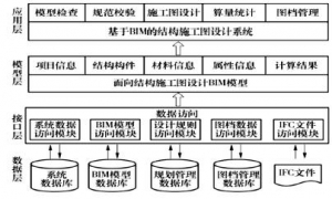 图5梁实体和柱实体关联3实现BIM模型的设计 3.1设计BIM模型 BIM模型的设计既要满足当今需求,还要重视BIM技术的未来发展,根据IFC的罗星结构,并且兼顾模型的方便性以及运行效率,从而将简化的IFC模型应用于BIM模型组织结构中,从而确保模型的高效性以及质量,并且方便IFC模型文件的导出,常见的BIM结构施工图罗星结构主要包括属性定义模型、材料信息模型、计算结果模型、结构构件模型四个部分,其中结构构件模型通常采取面型对象结构,将所有的结构构件均派用于建筑构件类,比如梁、板、柱等,并且通过构件关联类建立结构设计结果和结构构件之间的两部分关系,利用计算结果类与建筑构件类的耦合关系,从而实现结构构件与计算结构的关联建立关系,材料信息模型通常包括钢筋材料以及混凝土材料两种信息,并且依据材料关联类建立结构构件与材料属性的关联,属性定义模型实现了BIM核心的动态扩展,并为其提供技术接口,并且依据属性定义关联类,完成了结构构件动态属性的概念定义。 3.2实现系统 通过利用上述BIM模型,采取AutoCAD二次开发于VisualStudi-o.Net设计平台,从而实现BIM建筑结构施工图的设计,进行作图时不仅实现规范要求,还要表现设计特点,智能化系统才可以更好的仿效工程师制作施工图纸的过程,归纳工程设计人员的制图思维和绘图流程,产生专业工程师绘图程序,将录入设计模型转化成墙、柱、梁和板施工图的统一数学模型信息。绘制的施工图模型在AutoCAD上能够依据不同制图过程来反映施工图,模型在描绘施工图方面非常完善,能够开放选用,实现每个工程师的特点,并且能符合施工图显示方式的改变。如图6所示,主要包括应用层、模型层、接口层、数据层,其中,数据层是系统数据的主要来源,主要包括IFC文件信息、图档管理信息、设计规则信息、BIM模型信息以及系统信息,接口层是实现BIM模型物理储存数据的接口,BIM模型的提取可以依据IFC访问接口实现,除此之外,BIM数据库到内存BIM模型的映射过程可以通过BIM模型访问接口实现,模型层是BIM系统核心,根据BIM模型的作用满足实际结构施工设计的标准,应用层是BIM的各项应用,不仅能实现施工图设计,还能够进行设计模型与图档、算量统计、规范校验设计结果、检查三维模型等功能。