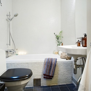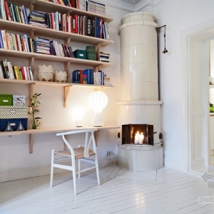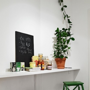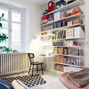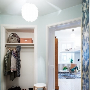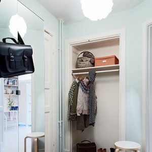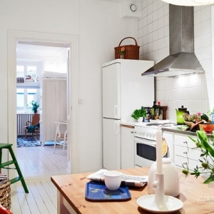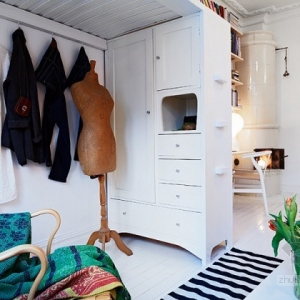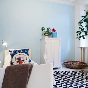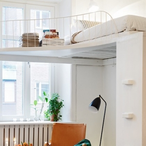 这是具有北欧风情的一套公寓,很适合单身妈妈和她的孩子居住,全白色的客厅之中有原木色的书桌架,而厨房却有着满墙的红白色的花朵,而推开卧室的门相信淡淡的那抹蓝色绝对会让你暖心。而屋子特别之处便是客厅那在柜子上的床,利用了空间的层高搭建了这样一个另类视角的角度来,虽然只有51平米,却是一个理想之家。