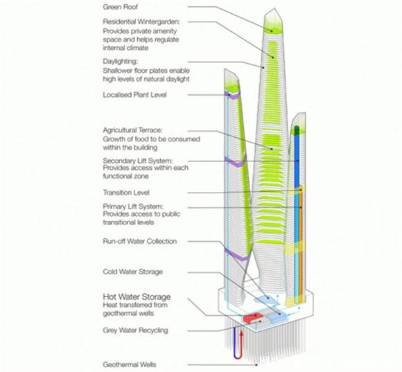 图:香港“接吻塔” 此项目被命名为“生态建筑”(Arcology)摩天大楼——使用了一个结合了建筑和生态的术语。这是WestonWilliamson建筑师旨在强调结合交通的一系列建筑之一。“如果建筑正下方没有高铁线,就没有这座生态建筑塔楼。” 建筑综合体包括住宅、办公室和零售店。这将直接处在高铁线路之上——拟扩建的广深港高铁。塔楼的定位将有助于综合体划分成三个区域,创造250000㎡的楼层面积。商业区位于低层,而居住区则位于较高的楼层。 “建筑的形式是为了产生出最高质量的楼层空间,同时与香港中心场地的错综复杂相呼应。”建筑设计公司表示。在地面层,这三座高塔之间形成了一个面朝维多利亚海港的大型中央广场和一个广阔的公园,创造了大量沿着中央滨水区的绿地。随着建筑的上升,每层逐渐拓宽,形成更深的空间,给予建筑的使用有了更大的灵活性。 |