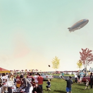 华盛顿红人队体育馆球迷们穿过一系列横跨人工河上的桥梁,可以通达这座雕塑感的体育馆并进入场内。这条水道全年可对皮艇爱好者和冲浪爱好者开放。效果图中也展示了体育场的墙壁可用于攀岩和速降运动。