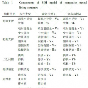 图1隧道施工BIM模型复合式衬砌隧道BIM模型的构件可划分为超前支护、初期支护、二次衬砌、仰拱填充、防排水、沟槽等6大类别。模型构件命名规则使用“构件类别+构件类型(围岩级别、衬砌类型)”。隧道围岩级别划分为Ⅰ—Ⅵ6个等级,在每一围岩级别下,又划分为不同的衬砌类型,以英文字母表达。限于篇幅,定义了Ⅴ级围岩和a、b衬砌类型的构件命名示例,如表1所示。
