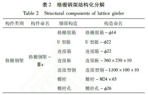 表1复合式衬砌隧道BIM模型构件命名针对构件的细部构造,建模时需考虑进一步结构化分解,从而设计标准化构件。细部构造的命名也宜使用“构造类别+构造类型”规则,而构造类型一般宜使用“规格”参数。以下以格栅钢架为例,进行详细的细部构造分解,如表2所示。