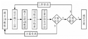 BIM模型建模的关键是开发构件资源库,构件定义的内容主要包括构件命名、构件编码、建模精度和信息粒度4方面,其中信息粒度包括几何信息和非几何信息[5]。建模精度是指构件在模型中的单元大小,隧道施工BIM模型中各构件的建模精度需满足施工工序管理的要求,具体如下。 1)超前小导管、管棚、中空锚杆、砂浆锚杆的构件单元,宜按1环的组件形式,相邻2环呈梅花状布置。 2)钢筋网、型钢钢架、格栅钢架的构件单元,宜按1环的组件形式。 3)喷射混凝土的构件单元,宜按开挖步纵向长度。不同围岩级别差别较大,一般为0.5~3.5m。 4)仰拱填充、底板、仰拱及仰拱部防水板构件单元,宜采用施工模板的模筑长度,一般为6~8m。 5)拱墙构件单元,宜按模筑纵向长度,一般为10~12m。 2BIM在隧道施工中的应用 2.14D虚拟施工 4D虚拟施工是用AutodeskNavisworks的虚拟仿真环境,对3D几何空间模型添加时间维度,虚拟推演实际施工过程[6-7]。具体来说,是将BIM模型与施工组织进度计划相关联,以进度驱动模型的虚拟仿真。具体技术路线如下: 1)用AutodeskRevit建立3D数字模型,赋予每一构件施工工序属性参数; 2)用Project编制工序的时间任务项数据源; 3)用Navisworks集成模型和工序时间数据源,在虚拟仿真环境中实现模型的虚拟建造。同时进行实时的过程交互,虚拟推演施工方案,动态检查方案可行性及存在的问题,优化调整施工装备、工艺等[8-9]。基于BIM的虚拟施工方案流程见图2。
