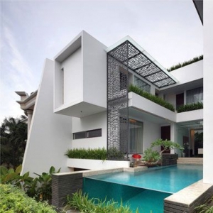 这座房屋位于雅加达的一个小型居民区里,在设计中,私密性是最关键的。从入口到房屋都是无缝连接,但同时又尽可能扩大了自然照明和交叉通风。立面的风格非常精细,并对内部空间的形成起了关键作用。 主要的起居空间向上抬升,改善了视野,又避免有人从旁边道路上能看到内部。由于起居空间的上升,池塘成了一个关键点。迷人的热带景观沿着池塘伸展开去。 每一个相互连接的空间都创造出新的体验,并很好地利用了热带的气候、光照和花园。为了塑造建筑的识别性,一个独特图案的金属遮阳板沿着阳光的路径搭建起来,看上去有点像DNA密码的基本形式被转换成了图案,相当有趣。