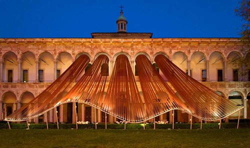 每年米兰设计周,都少不了一些空间装置作品的点缀。在这一周内,它们是这座城市最好的装饰物。 今年米兰设计周期间,来自北京的 MAD 建筑事务所受意大利媒体 INTERNI 邀请,创作了公共空间装置作品“无际”(Invisible Border),作品位于米兰大学 Cortile d’Onore 的中央庭院,展出时间为 4 月 11-23 日。 这算是一场命题作业,展览的议题为“打开边界”,MAD 团队尝试捕捉并诠释风和光线对环境造成的变化,用四氟乙烯这种极其坚固的半透明聚合物,制作了一张从半圆形的 15 世纪古罗马建筑上方向庭院中部地面延展的幕帐,围合成一个新型开放式三角形空间。这种四氟乙烯材料常被用作体育馆和其他大型场所的穹顶材料。 MAD 创始人马岩松称:“建筑师一直热衷于讨论和定义边界,让建筑划分空间和功能,区分自然和人工。而社会上也存在着各种有形无形的边界。 边界区分并保护了差异性,但同时却可能阻挡了开放与交流。” 相对于打破边界,马岩松在想的是如何让边界变得更有活力,更有趣味,“所以我们决定在传统建筑严格定义的庭院空间和室内空间的边界做这样的尝试,创造一个模糊传统和当代、内和外的新型公共空间。边界可以不是一条线,区分内外。” 映着庭院中绿意盎然的草坪,这个长 31 米、宽 16 米、高 14 米的橙红色渐变系装置作品显得醒目、跳跃,阳光和风的流动成为了改变装置运动节奏的元素,空间随着阳光的透射和风的流动不断变化,成为人们日常休憩交流的公共场所,装置底部波浪形的金属线条好似也是对风的回应。 MAD 团队希望这个温暖、灵动、自由的新空间,能够带来开放、交流、对话的氛围,提出新的思路。 就在今天,马岩松还将现身米兰设计周,带来《山水城市》和《与自然对话》两场讲座。 |