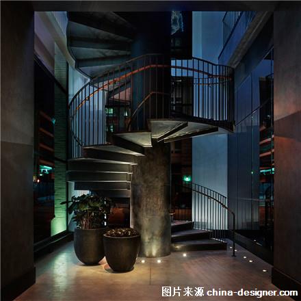 黄铜材质的壁灯和白色灯罩的落地灯精致且低调。艺术家 Katie Yang 还为其创作了石膏制的墙壁挂饰,与常见的家居装饰画相比,倒是要特别几分,更添艺术气息。 相比之下,楼下酒吧的设计就要浓墨重彩很多。深色木材和金色的金属件轻易就烘托出夜店的氛围。而连接较低公共楼层及中庭空间的是盘旋的钢质楼梯。