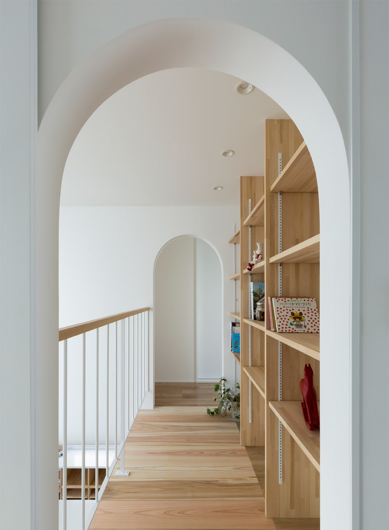 这是一座位于日本滋贺县的紧凑型小住宅——Outsu House,房子主人是一对年轻夫妇和他们的小女儿。 房子的屋顶有微微的坡度,其他部分的建筑元素大多采用圆弧倒角处理,比如弧形的门洞、窗户,甚至屋顶。