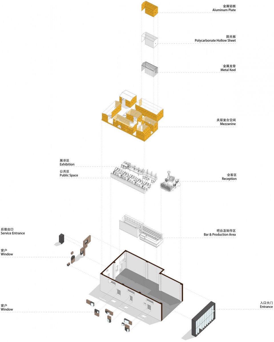 ▼ 体验馆内部的功能结构,axonometric of the T.Loft