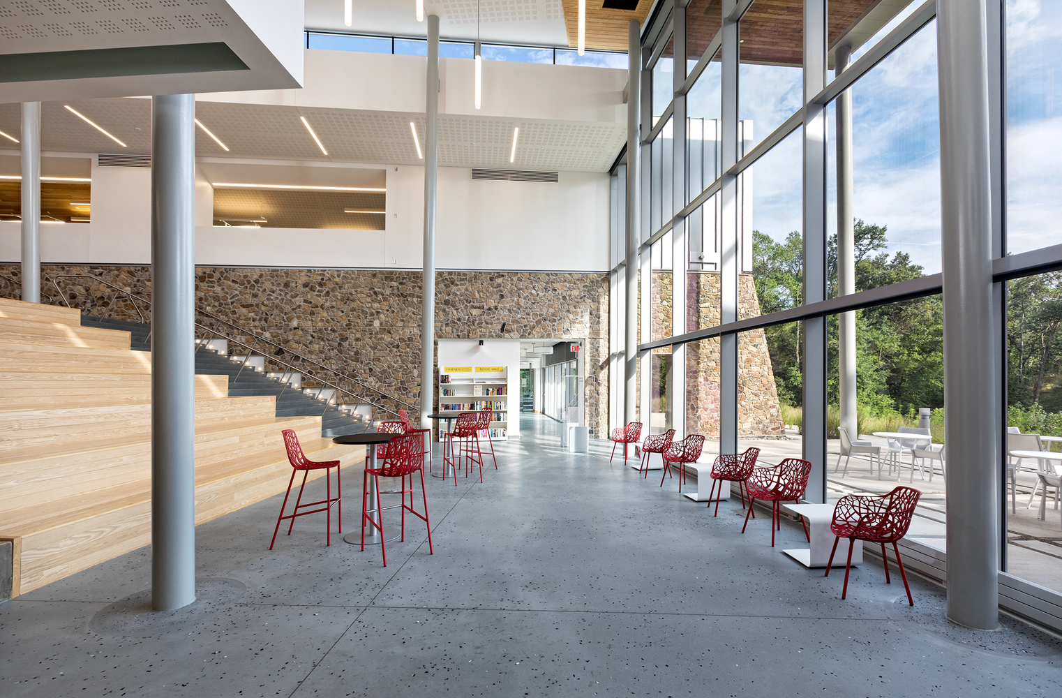 几个体量之间的空间从入口处的标高沿斜坡从场地下降至树林。这一空间延伸至儿童阅读区和社区活动空间。这些夹缝中的空间通过为大台阶上的偶遇与下方的咖啡吧和平台提供空间,来加强本地的联系,同时也偶尔被用为露天影院。