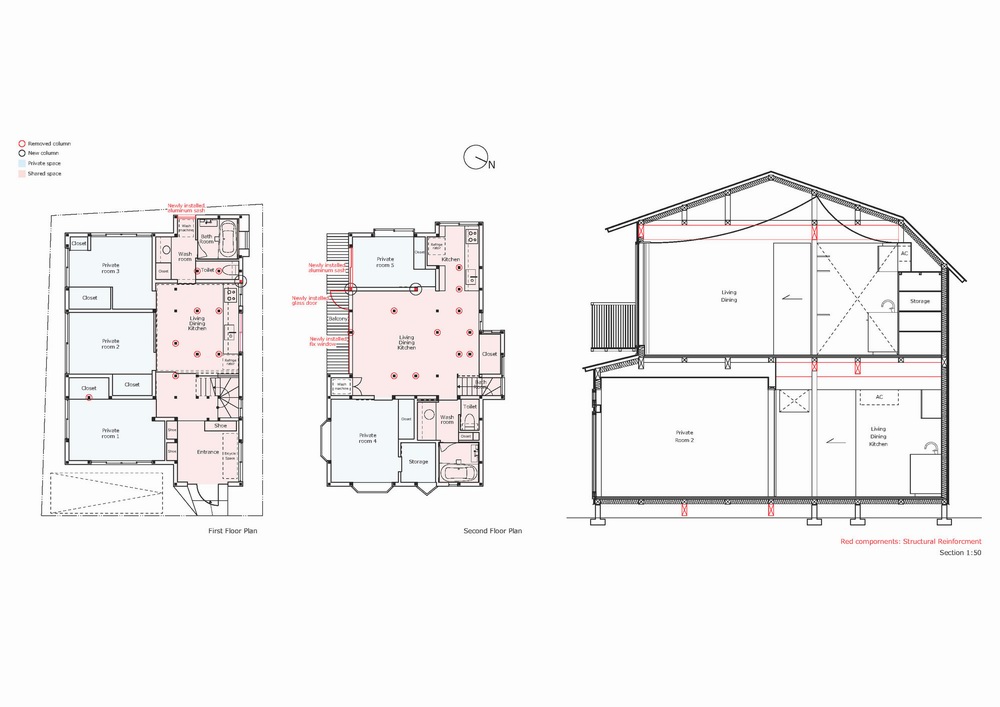 带着这些需要解决的问题,tomomi kito architect & associates的设计师开始改造空间。 首先研究每个房间的位置朝向,改变窗子的位置与大小,让光照与通风得到改善。每层设置一个连通所有房间同时与室外有联系的共享空间作为家庭室,加强家庭成员间的沟通机会。