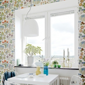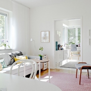 这是一个具有小资情调的家居。客厅作为一个休息区,有一个共6人吃饭的餐桌,还有一个阅读的角落,设计严紧大方,粉刷得雪白的墙壁让窄小的空间显得很宽敞,与实木复合地板相结合,是瑞典典型的搭配风格。卧室也是非常明亮的,床头柜双人床,书桌小型的工作台,有两个用纸糊的花墙纸的地方充足存储物品,次卧室是婴儿房间,布置得比较可爱,用一些格子碎花布艺装饰,显得很温馨。厨房为了防弄脏,一边贴了如春天气息般的鲜艳花草图案的墙纸,阳江位于客厅出口,向南方向,种植一些花草,一个完整的小资家居就如此落实设计下来。