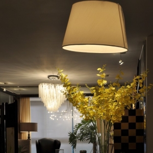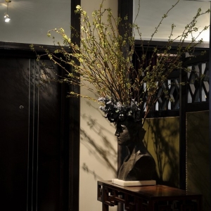 住所的主人是一个为了事业发展而定居上海的香港设计师。项目的主题具有典型的老上海特征并且符合现代人居住。室内装饰背景和艺术摆设,展示了主人对艺术的个性化追求,尤其偏爱明代和上海五十年代的家具。整个房间的基本色调是黑胡桃木,并以紫色、乳白色,及皮革的金色色调搭配融合。墙上有巨大的镜子和不锈钢,以及像现代吊灯的配件,使得这个上海度假别墅的深色调更加富有特色。洗手间大胆的运用了黑、白、蓝对比色调,表达了一种爵士的风格和黑白的视觉吸引力。