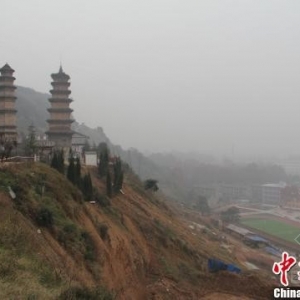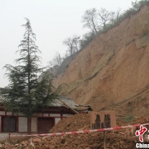 华严寺,佛教华严宗祖庭,因其拥有位列四大唐塔之一的华严寺塔而闻名,位于陕西西安市长安区少陵原半坡。历史上多次滑坡使五座佛塔仅存两座。2011年连续降雨,造成华严寺两侧塬体数次滑坡,导致寺内仅存的两座祖师塔随时面临着再度滑坡的巨大威胁。图为26日拍摄的现场。