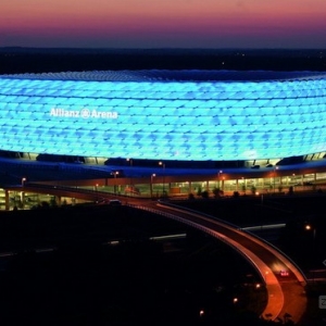 欧洲最现代的足球场 外观和功能都近乎完美,位于北慕尼黑体现未来主义的安联体育场是一座享有声望的足球场,是两大足球俱乐部拜仁慕尼黑和慕尼黑1860队的主场。在2006年1月,为了让这座欧洲最现代的足球场满足足球联赛需要,规划许可设计将座位数从66000座提高到69000座。2006年6月9日,当世界杯揭幕站在安联体育场举行时,全球约有15亿的观众收看了这场比赛。
