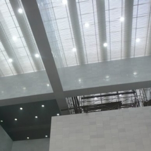 对照上下两图可以清楚地看到被改变的部分 对照效果图和未完工的照片,可以看出在建筑外立面上有类似陶板悬挂,板与板之间留有缝隙。但是领导认为这样看上去像没完工,所以就堵上了这些缝隙。