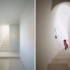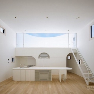 FUTURE STUDIO设计日本的Light Stage House,位于广岛。住宅所在场地由于受到相邻建筑的遮挡,南向的阳光无法照到。于是建筑师将建筑的外表面设计成了无转角的圆滑造型,以最大限度的迎合有限的光照,为室内空间争取到了充足的阳光。
