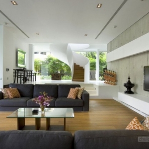 这个住宅占地面积6400平方英尺(594.60平方米),是为一对夫妇和他们的三个孩子设计的,客户希望有一个能够使孩子们自由在室内室外玩耍的空间,二层悬臂覆盖下面的车道,它内部包含隐私的起居空间,由主卧,四个卧室和两个浴室组成。悬臂结构形成一个封闭的保护的入口空间。