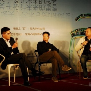 活动分为上下半场,上半场由两组对谈组成,杭间和石大宇的对谈定名为善意之竹,话题围绕杭间提出的善意设计及石大宇的竹计划的思考展开,这也是源于三年展,杭间作为总策展人并负责了分展览知竹。他对于设计一直有着严肃的思考,最近的著作《设计的善意》也讲到了这个问题。杭间研究中国设计多年,他认为改革开放30年后,虽然很多人感觉设计发展的很快,但他认为“除了平面设计这一块稍微还有一些可以讲之外,从产品设计和其他更多领域来说,中国设计跟世界设计的差距还是相当大的。但是,这不是中国设计师的问题,而是中国的产业结构的问题。是中国人的价值观和消费的方式对我们的设计产生影响的问题。”