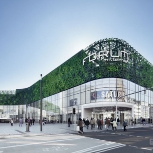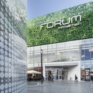 两个建筑和广场一起展现出城市的效果。建筑物的定位和外形精确,来往的人流组织有效、合理,把中央广场变成了一处公共场所。内有公共图书馆、Mitterlrhein博物馆和Koblenz游客信息室。这些不同的文化机构组合在一起,提供了开发不同机构协间同合作的机会。中央大楼独立在新的中央广场内。 在开放的广场上,三个功能区均有各自的进出口并垂直发展。室内不足30米高的空间把不同机构联系起来,营造了明亮、轻快的氛围,提供了良好的视角。大楼极其便利,中央大厅在每个方向都有入口,大厅也因此是现代化结构的一部分。圆柱形建筑有双层表面,上为白色的丝印玻璃结构,像是建筑的第二层皮肤。不同的出口处的外层表面拥有广阔的切面,可以直接看到大厅和入口处的景象。商场的Mitterlrhein论坛为水平、扁平式结构。购物中心的地下一层、0层和地上一层为销售区,二至四楼有技术设施和可容纳约740辆车的停车场。正面的设计考虑到了用户的感受。底下的两层有商店,正面为玻璃,像彩带一样缠绕大楼。最顶端的三层被人工的葡萄叶所占据。结构的基座是一片抽象的葡萄叶,用3D形状自由地表达出来。整个表面只由这一种元素构成,通过加热成型工艺制作出大量的高质量的元素。 大约2,900个一模一样的三维立体形铝元素被涂成三种色调的绿色,组成了这个独特的表面。