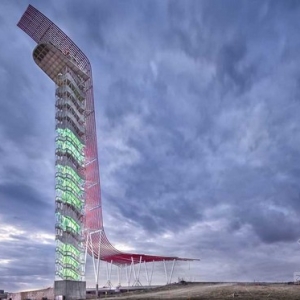 本露天剧场位于美洲赛道的盛大广场,其利用了自身的地理优势,从声学和视觉上增强了表演效果。观众们可从草坪后进入露天广场,经过两层共计5233个固定座位,向下朝着舞台走去。固定座位前排中间部分是9排包厢座位,视觉体验效果最佳。地面座位区域可灵活组织,进行多种多样的节目演出,另外还可增加1528个临时座位、宴会桌或者站立区域。赛道盛大广场的瞭望塔和奥斯丁360露天剧场令人流连忘返。27英亩(约11万平方米)的广场,三面与赛道相连,处于赛道的中心位置,给大多数观众提供了极佳的公众体验。 当游客们进入广场,首先映入眼帘的是大型的硬景观和草坪,共计大约有16000平方英尺(约1486平方米),在广场一端的倒影池和在另一端的塔楼和露天剧场,其强烈的轴线关系造就了惊艳的第一印象。有多种多样的园林景观分区围绕着广场,与独一无二的活动场所相映衬。作为主公共空间和3.4英里(约5472米)赛道的设计公司,Miró Rivera负责其建筑美学和场地体验的设计。其建筑语言与精密、活力和性能至上的赛车相辅相成,同时在视觉上与横幅、广告牌与大型平面广告互相衬托。设计师们讲究建筑结构的创新,该结构不是藏在大楼外立面的背后,而是做为该设计的一部分。 场地设计的一个很突出的设计主题就是红色钢管的反复使用。钢管从头垂落到瞭望塔边上,作为露天剧场舞台的雨篷,与此同时也突出了主正面舞台。本剧场衬托出了赛车和赛车运动,为两者的结构缔造了视觉体验的延续。