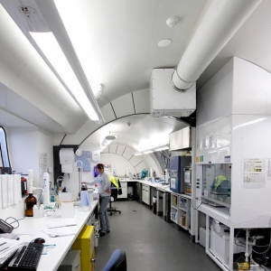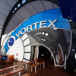 建筑表现了顺着水管周期循环流动的水流,内部包含了办公室、实验室和一个说明性的体验区,创造了一个类似的水循环工厂。曲线形的平面内设有渐进式的圆形小空间,容纳了各个不同功能,创造了探险式的空间序列体验。这座建筑希望能提高人们的节水意识。建筑建在一座人工湖上,湖水将冷气和其它环保能源输送到建筑中。因为湖水温度稳定,建筑在夏天的能耗非常低。来自湖底的冷水流经热交换器,将冷空气送入室内。夜晚,湖水被抽到屋顶进行冷却,以备白天使用。冬天,沼气热电联产系统中的剩余热气将用于室内取暖。这一系列可持续设计让涡流中心尽可能少的耗费天然气和电网中的电力。