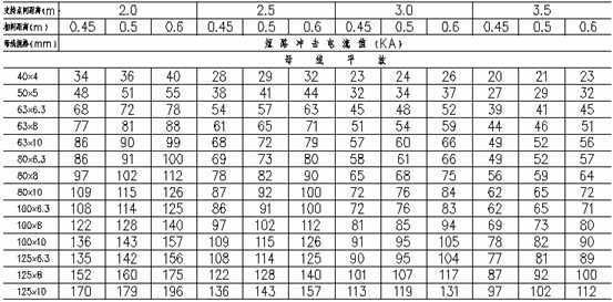 以上计算UK取10%. 2.主母线短视耐受电流选择4S,主变量考虑到保证主母线供电的可靠性,当分支母线侧短路故障时,应使分支母线断路器首先跳闸。而分支母线短时耐受电流选择为2S,已大于分支母线实践故障切除时间(电流互感器规定为1秒中能承受的热电流)。 3.设备实际运行时,如负载电流大于表1所列各种母线允许的安全载流量,必须重新选择母线截面。 4.按表1选择结果是否能满足额定峰值耐受电流(动稳定电流)的考核?什么叫动稳定电流?是指设备在规定使用条件下,当系统发生短路故障,当短路后半个周期时的全部短路电流的瞬时值,也是短路电流的最大瞬时值,该值等于2.5倍额定短时耐受电流,也称短路冲击电流。根据“工业与民用配电设计手册(第三版)”中的推荐,铜母线允许短路冲击电流,详细在表5-23中列出,现将该表转录于下,供应用参数! 附表:铜母线允许的短路冲击电流值 5-23