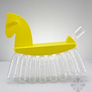 荷兰设计师克拉斯•库肯用类似矿泉水瓶的材料,制作出形状各异的花瓶。无独有偶,中国设计师石川则用矿泉水瓶制作出不同色彩和形制的玩具马,一方面宣传“废物利用”的环保理念,另一方面则与国际上流行的“糙”设计理念暗中相合。
