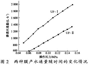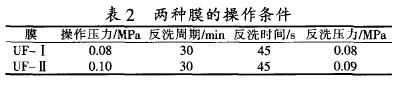 由图2可以看出,两种膜的产水通量与操作压力呈线性关系变化。而通过实验可知,两种膜出水浊度不随操作压力的变化而变化,出水SDI 随着操作压力的改变也变化不大。考虑到比较高的操作压力不仅能耗高,而且膜污染比较严重,反洗周期较短,所以在整个实验过程中,鉴于超滤膜的性能参数以及在满足纳滤进水水质要求SDI<3及进水水量660 L/h的情况下,确定两种膜的操作条件见表2。