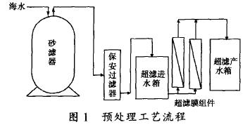 反渗透(RO)用于海水淡化作为解决淡水资源危机的有效途径之一,已经在许多国家和地区得到了广泛的应用。在反渗透海水淡化工程中,由于海水中的盐度、硬度、总固溶物及其他杂质的含量均较高,达不到反渗透及纳滤对进水水质的要求,同时每天的海水水质也在不断变化,因此,预处理是一个必不可少的步骤。反渗透海水淡化常规预处理方法包括加氯杀菌、在线凝聚和絮凝、多介质过滤、加酸调节pH、加防垢剂和还原剂、保安过滤等。传统预处理中的多介质过滤器和筒式过滤器并不能完全去除胶体和悬浮物质,出水水质会产生波动。另外传统的加药处理方式还对反渗透膜和环境造成污染。 2O世纪90年代后期,出现了集成膜技术(IMS)概念,即将微滤、超滤作为反渗透或者纳滤脱盐的预处理技术。IMS系统具有可靠性高、对原水的水质变化相对不敏感、操作费用低且均为商品化组件式装置的特点。受到国际海水淡化界的广泛关注。笔者考察了超滤一纳滤海水淡化预处理工艺中的超滤膜的长期稳定性,并进行了中试试验。 1实验部分 1.1 预处理工艺流程 根据实际情况,选定了黄岛附近海域作为实验现场,具体的试验流程如图1所示。