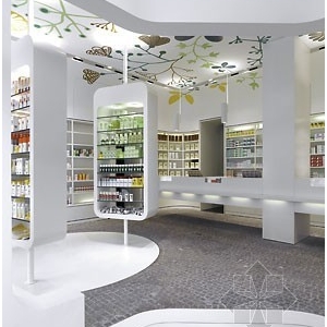 这是一个药店的设计,总体的彩色基调似乎是药店的特色,这个设计也是如此,货架上整整齐齐的摆放着各种药品,天花板上的设计让整个空间有一种灵动的感觉,而且充满了自然的气息,相比能让每一个顾客获得更好的心情。