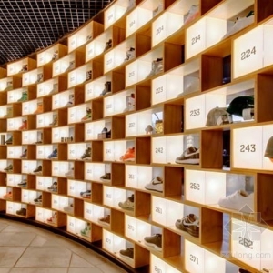 这是位于澳大利亚悉尼的一家运动鞋店铺Sneakerology,在这些排列整齐的200mm x 600mm 的格子里,精心地收藏着各式各样的运动鞋。这些格子都一摸一样,但每行格子与其上下两行格子错位了半个格子的距离,如此这般,铺满了整个墙面。如果是一个格子的话,这么设计,那没什么特别,但是281个格子都是这样重复,它们就带给人们一次愉悦的体验。