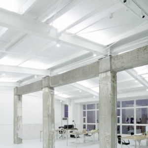 这是杭州零壹城市建筑咨询有限公司为自己设计的一个办公空间,位于浙江省杭州市。项目面积达到350平米。这是对杭州市中心一栋大楼旧有顶层空间的改造更新。原有顶层空间是大楼屋顶加建的仓库,包括电梯机房、消防楼梯间和倾斜的排水屋面。设计理念通过把握建筑材料的同质性、异质性以及时空性,创造旧有仓库空间和新办公空间的并置。 为了彰显正统建筑语言与建筑“方言”之间互动并行与辩证关系,设计保留、改造了一系列能够揭示其原有搭建的“非职业”的设计元素:钢构架屋顶通过白色喷漆处理,使原有锈蚀的混凝土梁柱依然作为结构核心被完全保留;房间采用架空的白色地胶板,五个镂空设计的地下橱窗玻璃镶嵌其中,展现了原有粗糙倾斜的排水屋面;从屋顶到仓库,从废弃到重新利用,疏散门的雨棚和粗糙的马赛克墙暗示着这片空间定义的变迁。 这个延续、重组、再现的空间设计中,马赛克和裂缝质感的材料层次,与白墙的崭新交织出一种暧昧的凝视。褪色而带有多次修补痕迹的旧水泥墙体与白色新墙体的并置创造了另一个层次的异质性。 重工业感的电梯机房通过窗口展示成为事务所空间的一部分,延伸了时空感并创造了其自身的语境。坏损的橙红色疏散门扇被移植作为事务所会议室的大门,使旧建筑的元素得到尊重,焕发它旺盛的生命力。 零壹城市建筑事务所的空间设计,试图在与空间功能吻合的职业建筑设计和粗犷的原有非职业设计之间,创造一种辩证的对立关系。超越单一的设计风格,讴歌创作的不拘一格,这也是“零壹城市”的设计理念之一。