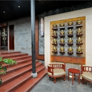 这是位于成都市宽窄巷子东头的一个火锅餐厅,是由(株式会社)葵美树环境艺术设计设计总监彭宇设计。2层半的建筑是新建的钢结构主体,仿旧制作的外墙。总建筑面积约1300㎡,设计开初对建筑空间重新进行了整理,形成了完整的围合式中庭空间,并在端景墙处加入了舞台的设计。设计主题融入了代表清末民初艺术的珐琅彩瓶的概念,从珐琅彩瓶中提取图案元素、色彩元素、造型元素来结合实际的用餐空间。主材以花梨木、红蓝白相间的人造石、艺术面的米色大理石为主,将材料在空间造型中运用当代的手法来演绎。