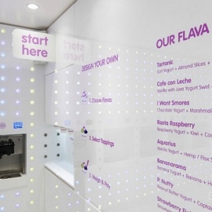 这是一家位于纽约的冰冻酸奶店,这里有一个特殊的设计,它结合了实验室般的设计和功能,,购物者可以手动创建自己独特的冰雪组合。在充足的明亮色彩和LED灯照射下, Flavaboom未来的发展让人看好。在134平方米的店铺中包括了一个 9米长抛光白墙和LED灯。当灯光闪烁时,墙壁上形成数百个形态各异的条纹。