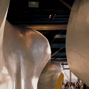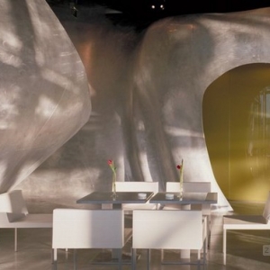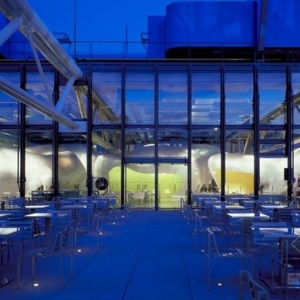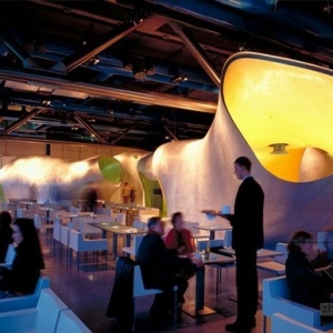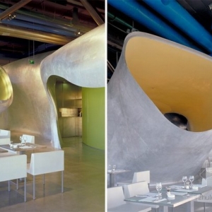 “Georges”餐厅位于法国蓬皮杜艺术中心(Centre Georges Pompidou)的六层,近日开业,餐厅是由法国建筑事务所Jakob & Macfarlane设计。“Georges”餐厅设有一个宽敞的室外平台,内部包含了若干个多种多样的,不定性的体量,通过这种形式,建筑师为空间添加了一种新颖的背景和风格,创造出了独特的室内外景观。 “Georges”餐厅平面的布置十分灵活,一系列表面变形的体量好像嵌在地面上一样。这些内部空洞的变形体有着多种功能,它们可以作厨房、吧台、寄存处和私人接待室,不仅如此,它们还可以根据特定需要调整大小形态和位置。作为一种重新定义和组织空间的手段,这些异形体量还作为实体干涉物为餐厅营造了不同凡响的背景风格。