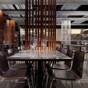 入口处有一个大壁炉。壁炉后面摆放了餐桌餐椅。有些餐桌之间用镀锌或者镀铜的管道网隔开。入门后,你可以看到右边的大吧台,这个吧台有些特别,是用管道密布而成的。酒瓶摆放在玻璃架上。店内另一端的长桌可以容纳较多的人聚餐。店内最深处是公开厨房的柜台,老顾客可以在这里看着厨师烹饪。地板用的是暗色花岗岩,餐桌用的是黑檀木层压板。厨房后面是酒窖和私人餐室,酒窖由玻璃和管道构成。葡萄酒储藏在打孔的黑色木墙中,木墙不远处则是酸蚀毛玻璃铺砌的卫生间。卫生间内可以看到一排盥洗池和一面长长的镜子。店内的环境不仅时尚新潮,而且热情奢华。管道饭店证明了巧妇并非难为无米之炊。 |