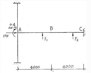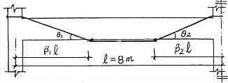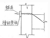 图2 计算模型 3.2 确定无粘结筋的布置 本工程把无粘结筋在梁顶处的折角设在梁柱交界处,如图1.其优点为:施工方便,能同时加强梁的正载面和斜载面强度,保持原楼面的平整。梁底折角的位置,即β1和β2的取值,一般为β1=0.25~0.5,β2=0.25~0.35〔3〕。Β1和β2的取值范围较大,如何针对本工程,求出合适的β1和β2值,本文对此进行了分析。取无粘结筋的拉力为1kN,梁端力矩为1kN×0.4m=0.4kN*m,0.4m为梁高的一半,无粘结筋的偏心距,由图1中折角θ1-θ2,可求出图2中的F1和F2,即F1=1.sinθ1、F2=1.sinθ2.本文以预应力(图2外力)产生的弯矩图形状与外荷载产生的弯矩图形状大致相同,弯矩值相反来确定合理的β1、β2值,即以预应力均衡地抵消各截面弯矩为合理。依此,取β1=0.45、β2=0.3.。 3.3 确定无粘结筋面积 由于无粘结筋与周围砼的应变不相协调,所以在极限状态时,其极限应力бpu的计算相当复杂。考虑到钢绞线费用在整个加固费用中所占比例较小,可采用保守的近似计算方法。假定外荷载作用下无粘结筋的应力增量与预应力损失相等〔2〕,则极限应力бpu等于张拉控制应力бcon。规范规定бcon可取0.7fptk,fptk为强度标准值,无粘结筋在折角处受力不利,本工程бcon取0.65fptk。本工程无粘结筋fptk=1860N/m㎡,бcon=1209N/m㎡。如前所述,大偏心受压的梁仍按一般梁计算其抗弯能力,则: 式中:Ap为无粘结筋面积,m为外荷载产生的弯矩,Mm为原梁的弯矩设计值,M1为单位无粘结筋力产生的弯矩(如图2)。取跨中和两支座所求的Ap值的最大值为加固所需的预应力筋面积,计算值为236m㎡,取用二根无粘结筋(2×140m㎡)。一般情况下,二根钢绞线便能满足要求。 4 施工过程 4.1 张拉过程: 采用YDC240Q手提式千斤顶,双控张拉。因钢绞线较短(17m),进行一端张拉,固定端为OVM15P型挤压锚具,张拉端为OVM15-1类片锚具。 4.2 端部锚固: 本工程柱边与梁侧面间距为5cm,故将侧面平齐,如图3所示。若这一间距较大,可用钻孔方法。梁底钢绞线折角处圆钢为Φ25,剥除该处砼保护层,将圆钢焊在梁底钢筋上。