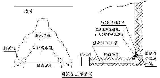 注浆前,先用水代替浆液灌注,以检查除注浆注管外其它部位是否有漏水现象,以免出现漏浆。试灌时记录灌水量和灌水时间,为确定灌浆量和灌注压力提供参考。注浆时,垂直缝应按先下后上的顺序进行。注浆管接埋设好的注浆管Ⅰ,打开注浆管Ⅱ阀门,灌浆开始后,逐渐升压,待注浆管Ⅱ出水后先不要封闭,见浆液后立即封闭其孔,仍继续压浆,使浆液沿着漏水通道推进。并把注浆泵开泵到规定压力值,停泵。让灰浆慢慢渗入,到表面压力下降到0.1Mpa时,二次开泵升到规定压力值,如此反复进行,直到压力稳定在规定压力值不再下降为止。当压力解除后不再有漏水和渗水现象时,该处注浆完毕,移到下一注浆孔灌注。 4.3.2 引流 对于墙面大面积渗水,这方面原因主要是二衬内部防水板被破坏,而底板泻水管堵塞,致二衬内水位上升,便造成二衬混凝土大面积渗水,对于这种渗漏水情况的处理,主要是通过引流的方法加以处理。方法如下图所示:
