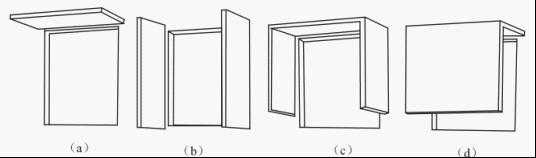 图7—10 简易遮阳的形式 2、窗户遮阳板 在窗前设置遮阳板进行遮阳。窗户遮阳板按其形状和位置可分为水平遮阳、垂直遮阳、混合遮阳及挡板遮阳四种基本形式(如图7—11所示)。