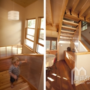 这家公司是一个家族企业,生产教育类的录影带和印刷材料。为了满足业务的多样性,其主要的业务分隔在两层中。仓库与录影带制作车间设在了底层,二层是办公室、图像设计室、会议室以及为将来发展而未作处理的空间。 从宽大的窗户能够看到周围市区的景色,也将日光投射进来。大胆的材料选用塑造了非常具有功能性和启发性的工作环境。内部空间用胶合板包面的墙体来引导流通路径,并界定了储藏室和展示空间等。 二层进行了重新布置,主要用于培养团队工作和创意行动。协作室的大幅玻璃板不仅是一面独特的擦写板,还可以隔开内部空间形成私密的空间。在封闭的楼梯周围还有几个地方供人们交谈和分享经验。