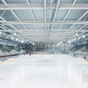 这座溜冰场能够举办国际性的比赛,设有1200个座位,表面面积为6700平方米。为了保持冰面有最好的溜冰质量,外层的隔热因子达到k22,两台冰冻系统利用4组气冷机组达到1000kW的能力;通风系统则保持6万cbm/hr的流速,用于溜冰场的除湿。此外,与附近大厅连接的加热系统可以回收过多的能量。