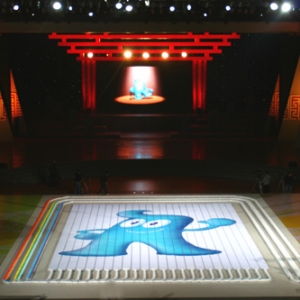 随着寓意吉祥的蚌壳的打开,闪亮的珍珠自然滑落,多米诺骨牌如水幕般铺开,由此中国2010年上海世博会吉祥物“海宝”的巨大图案显现出来。