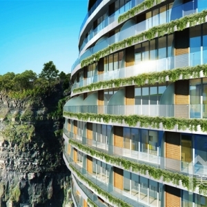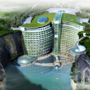 由英国建筑事务所Atkins设计的上海洲际世茂仙境酒店目前正在紧张的建造当中,该酒店位于中国松江,临近上海相邻,酒店的建造旨在丰富日渐稀少的人造景观。酒店高17层,地基高出地面两层楼的高度,其中大多数度假商业风格的酒店都位于这座高80米的建筑中。升高的入口随着由玻璃围绕的河流开始上升,之后随着地势的走向,流向悬崖边,成为一个瀑布景观,这里也是该建筑的垂直循环通道。
