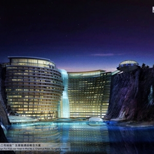上海天马山深坑酒店即将开工,由上海世茂集团投资建设,是世界上首个建设于坑内的五星级酒店,地上三层、地下17层、水下一层,并设有蹦极等娱乐项目。整个投资在6亿元左右,天然室内花园+大型景观瀑布+上有景观总统房+下有水中情景房。 站在松江区横山附近的天马山上,俯视百米深的大坑,只见坑壁四周岩石陡峭,坑里平静的潭水不时被微风“吹皱”,偶有两只小鸟掠水凌空,渐行渐远……这个昔日被垃圾腐蚀的大坑如今露出的“清秀”模样让人惊喜不已。 然而,更令人惊喜的转变可能将发生在今年年底。 一个海拔负65米的五星级酒店将在这个大坑内起建,并有望成为世界上人工坑内海拔最低的酒店。这是参与开发天马山项目的上海世茂庄园置业有限公司建筑设计部开发部高级经理李旭阳昨日透露的。据了解,目前这个项目正在有关部门的审批当中,有望在年底动工,整个投资在6亿元左右。