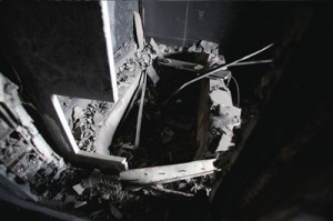 2009年2月9日,在建的央视新台址园区,因单位违法燃烧烟花,发生特别重大火灾事故。时隔一年,不少来往于东三环的车辆经过事发地点时,还不忘放慢车速,观望一下过火大楼的模样。 近日,进入这座大楼,用相机记录下大楼过火后留下的千疮百孔。 现场目击 站在30层平台上,能够听到被大火烧化的钢结构部件相互撞击的声音。平台顶部的天庭钢架有多处变形塌陷。顺着被大火熏黑的步梯,来到29层和28层,这两层为设备层,过火并不严重。27层的空中餐厅过火十分严重,大火穿堂而过,东、西、南三面玻璃外墙均被大火烤化,大火烧毁了全部内部装修。由于顶棚的装饰装修全被烧毁,通风管道全部暴露在外,很多被烧焦的电线从屋顶垂落下来。多处主体结构承重墙和立柱上都写着“拆”字。在楼层中部的厨房和设备间没有过火痕迹,厨房餐厨设备保存完整。 5层至26层为酒店客房。在现场看到,位于北侧的客房多数躲过大火肆虐,客房装修基本完成,其他方向的客房都不同程度过火,9层10层的部分客房被完全烧毁。 1层至4层过火痕迹并不明显。 地下室多功能区狭长的通道内看不到大楼经过大火侵蚀,停车场完好。 大楼简介 央视“过火楼”是中央电视台新台址工程的重要组成部分,是央视的电视文化中心(TVCC),被称为北配楼,邻近央视新大楼。 该建筑共30层,高159米,建筑面积103648平方米,地上部分主要由5层高的楼裙和30层的塔楼组成。两层地下室主要用做车库及设备用房。 电视文化中心大楼里计划建五星级的豪华酒店,酒店设在TVCC大楼主体内,第5层为酒店大堂及餐厅、商店、游泳池等公共活动场所。大堂上部南北两侧为300间客房合围成的中庭,主楼顶部为酒店的风味餐厅。