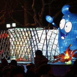 上海,2010年2月28日, 上海:元宵节里赏“彩灯世博园” 2月28日,市民在灯会上参观“中国馆”彩灯。 当日,上海龙华塔园步行街举行元宵节迎世博主题灯会。采用传统工艺打造的十盏巨型世博场馆彩灯集中亮相。