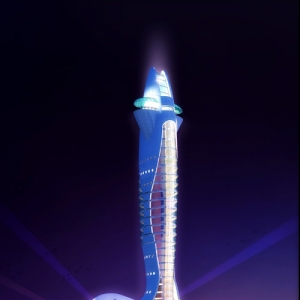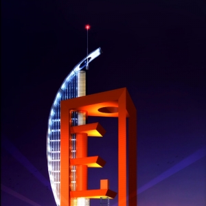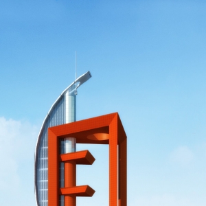 方案二说明 此方案采用雕塑感很强的现代设计风格。以汉字”国门“为造型要素,突出了丹东新区国门湾的特征。采用不对称的设计形式,红色”国门“的方正造型与白色弯型船帆造型互相对比,视觉冲击力强,具有独特的造型特色。一、二层设为城市建设展厅,展示丹东新区建设的成就,三层以上每层设置一定面积的房间作为”东北东部十二城市联络、办公及展示空间“。室外共设五层观光平台,可使人在不同的高度看到不同的新区景色。建筑总高度126米,最高处观光平台93米。