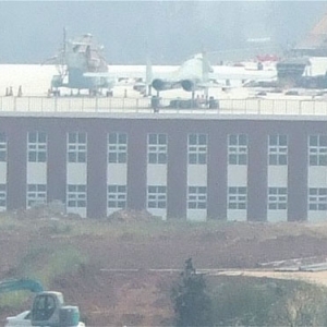 舰船设计研究中心园区航母式建筑上停放的苏-27和直-8。