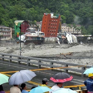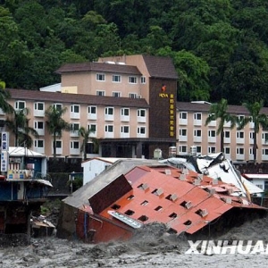 台风莫拉克破坏力惊人,台东县知本温泉区6层楼高的金帅饭店,9日近中午时受灾倒塌。 据台湾中天新闻报道,6层楼高的金帅饭店,9日早晨被发现倾斜20度,顿成危楼,附近民众立刻疏散。直到上午11点30分左右,金帅饭店加剧倾侧,引起围观的群众惊呼。不到20秒的过程,饭店在众人目睹下倒塌,横躺在滚滚激流中。 据悉,知本温泉区仍有将近4百人受困,急需外界救援。